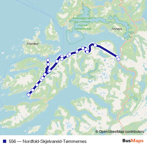 The first stop of the 556 bus route is Steigen kryss and the last stop is Nordfold. 556 (Nordfold-Skjelvareid-Tømmernes) is operational during everyday.