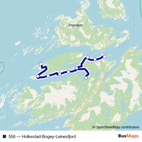 The first stop of the 558 bus route is Bogøy skole and the last stop is Holkestad. 558 (Holkestad-Bogøy-Leinesfjord) is operational during on weekdays.