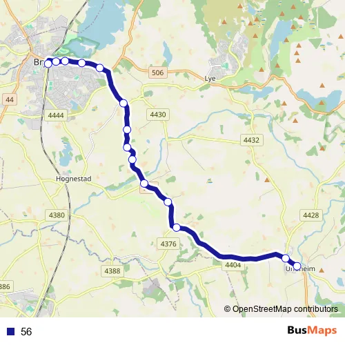 The first stop of the 56 bus route is Bryne stasjon and the last stop is Undheim sentrum. 56 is operational during on weekdays.
