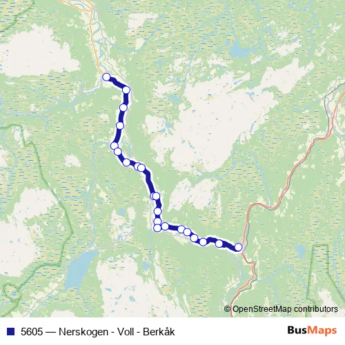 The first stop of the 5605 bus route is Å sentrum and the last stop is Rennebu skole. 5605 (Nerskogen - Voll - Berkåk) is operational during on weekdays.