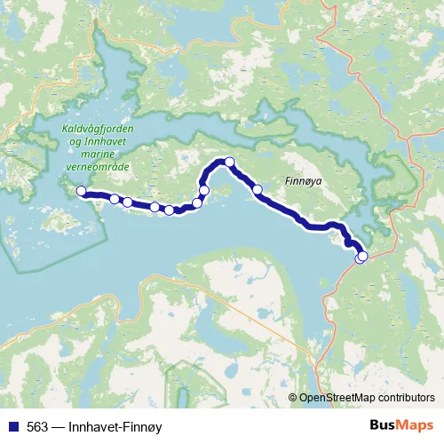 The first stop of the 563 bus route is Innhavet and the last stop is Finnøy. 563 (Innhavet-Finnøy) is operational during on weekdays.