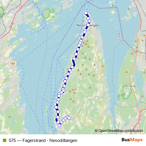 The first stop of the 575 bus route is Nesoddtangen and the last stop is Torneveien. 575 (Fagerstrand - Nesoddtangen) is operational during everyday.