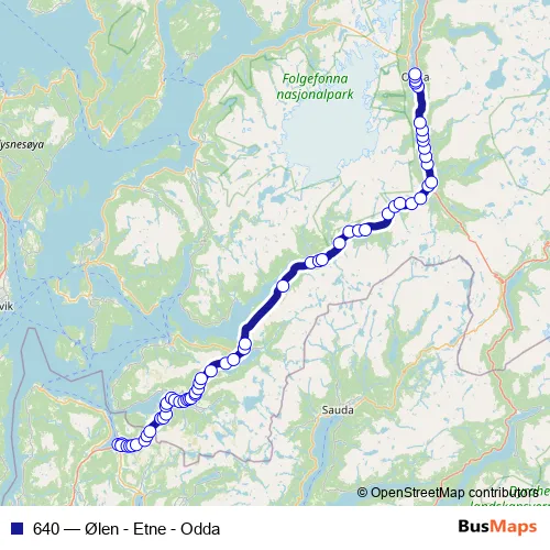The first stop of the 640 bus route is Ølen bussterminal and the last stop is Odda busstasjon. 640 (Ølen - Etne - Odda) is operational during everyday.