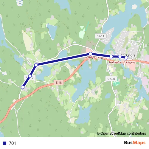 The first stop of the 701 bus route is Töcksfors busstation and the last stop is Långvassdalsvägen, Töcksfors. 701 is operational during everyday.