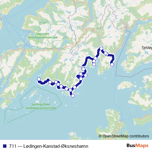 The first stop of the 711 bus route is Lødingen buss taxi and the last stop is Øksneshavn. 711 (Lødingen-Kanstad-Øksneshamn) is operational during everyday.