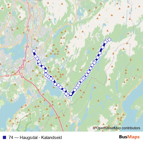 The first stop of the 74 bus route is Hausdal snuplass and the last stop is Nesttun terminal. 74 (Haugsdal - Kalandseid) is operational during on weekdays.
