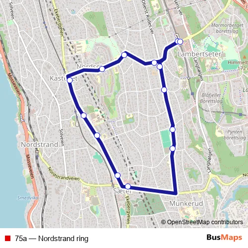 The first stop of the 75a bus route is Lambertseter T and the last stop is Lambertseter T. 75a (Nordstrand ring) is operational during everyday.
