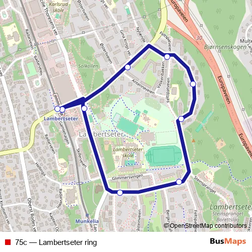 The first stop of the 75c bus route is Lambertseter T and the last stop is Lambertseter T. 75c (Lambertseter ring) is operational during everyday.