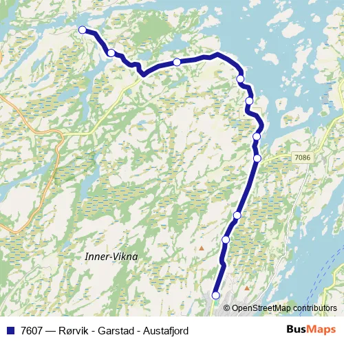 The first stop of the 7607 bus route is Ytre Namdal vgs. and the last stop is Nordaunet. 7607 (Rørvik - Garstad - Austafjord) is operational during on weekdays.