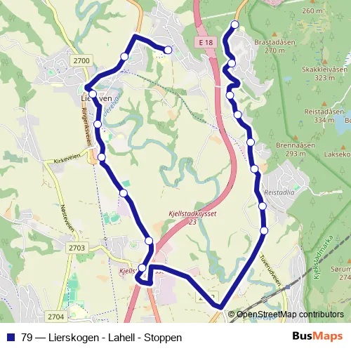 The first stop of the 79 bus route is Lierbyen skole and the last stop is Bråtasvingen. 79 (Lierskogen - Lahell - Stoppen) is operational during on weekdays.