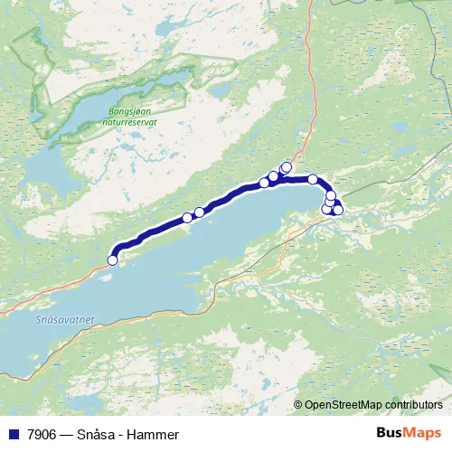 The first stop of the 7906 bus route is Snåsa skole and the last stop is Hammer. 7906 (Snåsa - Hammer) is operational during on weekdays.