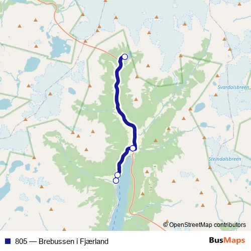 The first stop of the 805 bus route is Fjærland kai and the last stop is Fjærland kai. 805 (Brebussen i Fjærland) is operational during everyday.