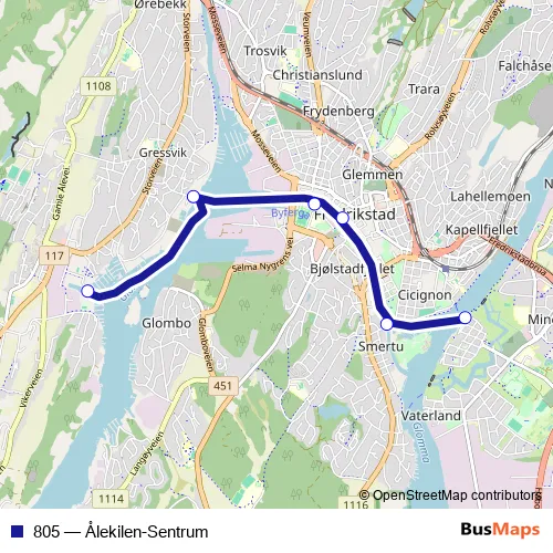 The first stop of the 805 ferry route is Ålekilen fergeleie and the last stop is Gamlebyen fergeleie. 805 (Ålekilen-Sentrum) is operational during everyday.