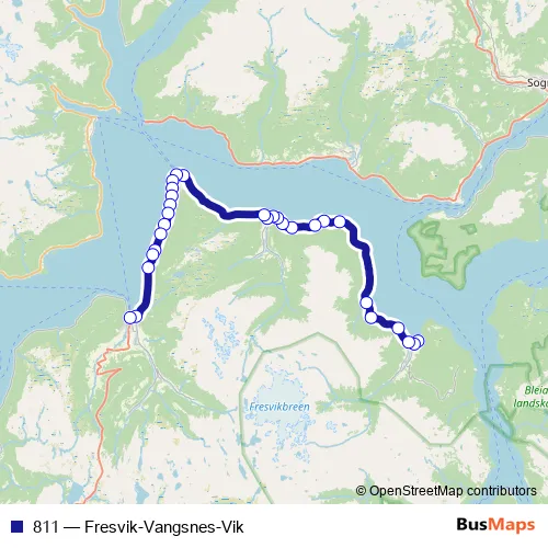 The first stop of the 811 bus route is Fresvik kai and the last stop is Vik kommunehus. 811 (Fresvik-Vangsnes-Vik) is operational during everyday.