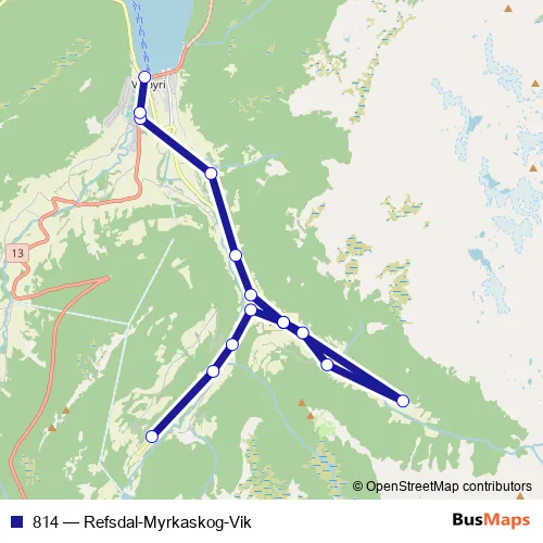 The first stop of the 814 bus route is Refsdal and the last stop is Vik kommunehus. 814 (Refsdal-Myrkaskog-Vik) is operational during on weekdays.