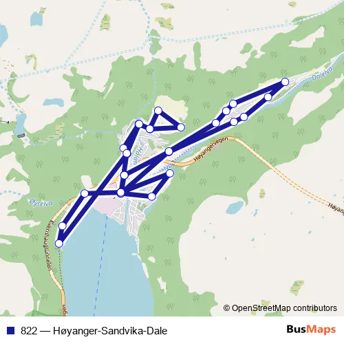 The first stop of the 822 bus route is Høyanger rutebilstasjon and the last stop is Høyanger rutebilstasjon. 822 (Høyanger-Sandvika-Dale) is operational during on weekdays.
