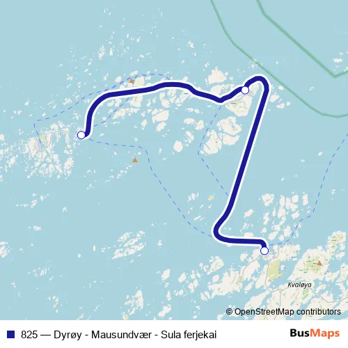 The first stop of the 825 ferry route is Sula ferjekai and the last stop is Dyrøy kai. 825 (Dyrøy - Mausundvær - Sula ferjekai) is operational during everyday.