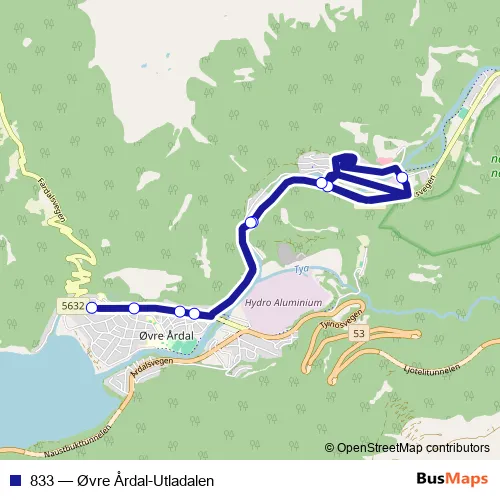 The first stop of the 833 bus route is Øvre Årdal Farnes and the last stop is Øvre Årdal Torget. 833 (Øvre Årdal-Utladalen) is operational during on weekdays.