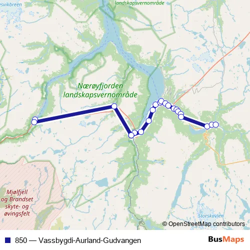 The first stop of the 850 bus route is Gudvangen ferjekai and the last stop is Vassbygdi. 850 (Vassbygdi-Aurland-Gudvangen) is operational during on weekdays.