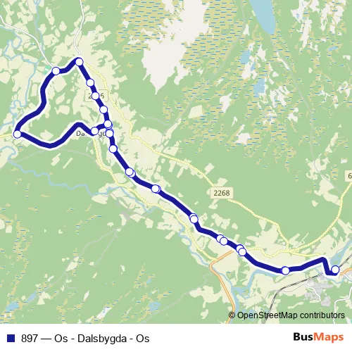 The first stop of the 897 bus route is Os stasjon and the last stop is Os stasjon. 897 (Os - Dalsbygda - Os) is operational during on weekdays.