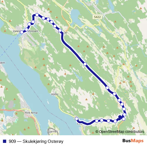 The first stop of the 909 bus route is Haus terminal and the last stop is Valestrand kai. 909 (Skulekjøring Osterøy) is operational during on weekdays.