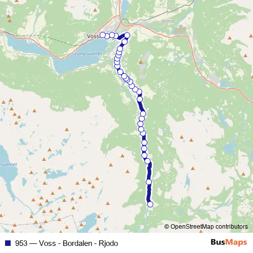 The first stop of the 953 bus route is Rong snuplass and the last stop is Voss stasjon. 953 (Voss - Bordalen - Rjodo) is operational during on weekdays.