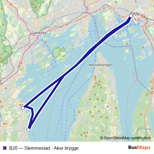 The first stop of the B20 ferry route is Aker brygge and the last stop is Aker brygge. B20 (Slemmestad - Aker brygge) is operational during on weekdays.