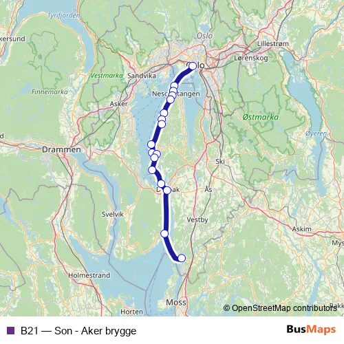 The first stop of the B21 ferry route is Aker brygge and the last stop is Son. B21 (Son - Aker brygge) is operational during on weekends.
