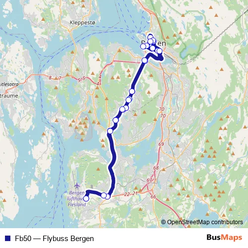 The first stop of the Fb50 bus route is Bergen lufthavn and the last stop is Bergen lufthavn. Fb50 (Flybuss Bergen) is operational during everyday.