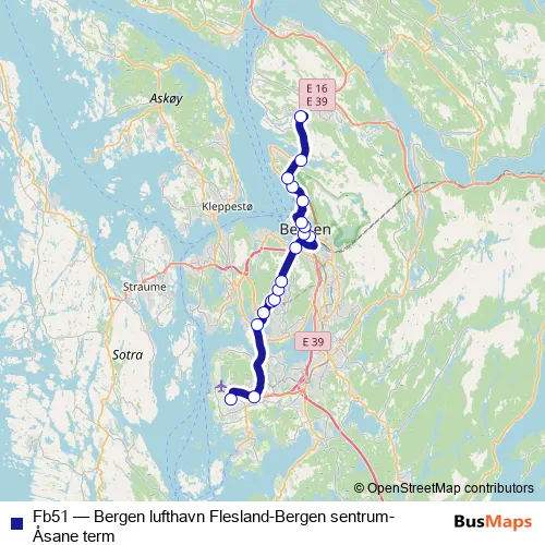 The first stop of the Fb51 bus route is Bergen lufthavn and the last stop is Åsane terminal. Fb51 (Bergen lufthavn Flesland-Bergen sentrum-Åsane term) is operational during everyday.