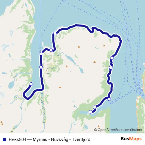 The first stop of the Fleks804 bus route is Tverrfjord ferjekai and the last stop is Myrnes. Fleks804 (Myrnes - Nuvsvåg - Tverrfjord) is operational during everyday.