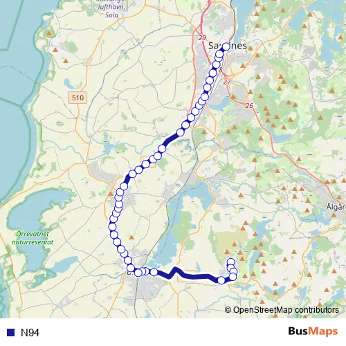 The first stop of the N94 bus route is Sandnes bussterminal Ruten and the last stop is Lyefjell. N94 is operational during on weekends.