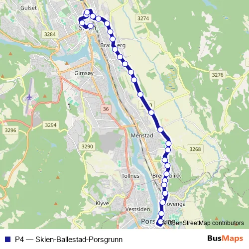 The first stop of the P4 bus route is Skien Landmannstorget and the last stop is Porsgrunn Kammerherreløkka. P4 (Skien-Ballestad-Porsgrunn) is operational during on weekdays.