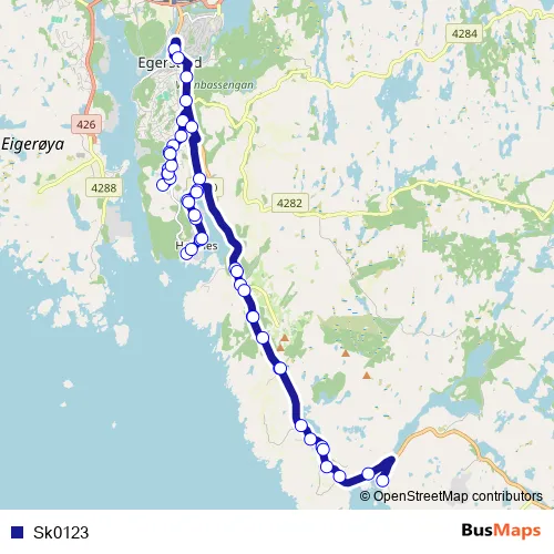 The first stop of the Sk0123 bus route is Egersund bussterminal and the last stop is Dyrnesveien. Sk0123 is operational during on weekdays.