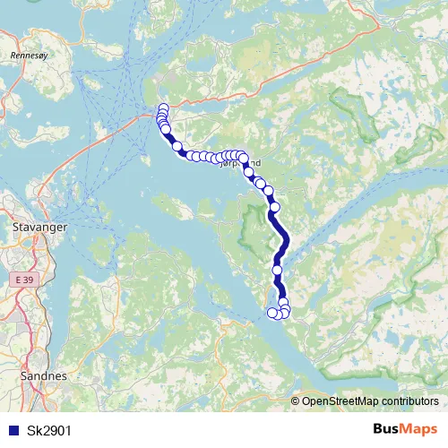 The first stop of the Sk2901 bus route is Strand rådhus and the last stop is Forsand kai. Sk2901 is operational during on weekdays.