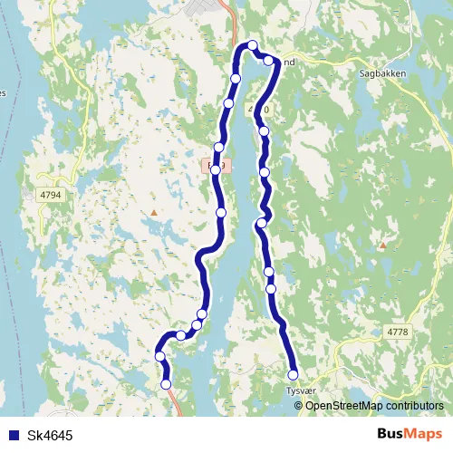 The first stop of the Sk4645 bus route is Tysværvåg barne- og ungdomsskule and the last stop is Hetland. Sk4645 is operational during on weekdays.