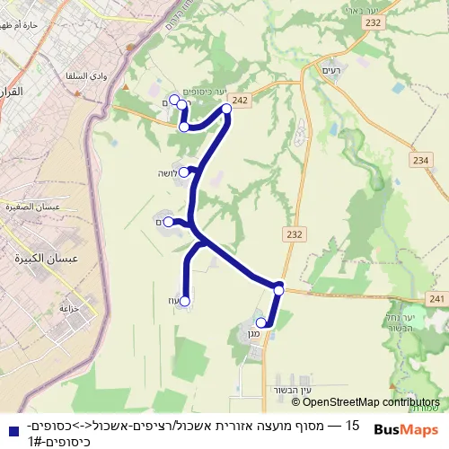 The first stop of the 15 bus route is Kisufim and the last stop is Eshkol Regional Council Terminal/Platforms. 15 (מסוף מועצה אזורית אשכול/רציפים-אשכול<->כסופים-כיסופים-1#) is operational during everyday.