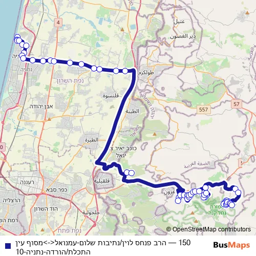 The first stop of the 150 bus route is Hamelakhim/Hagdud Ha'Ivri and the last stop is Harav Pinhas Levin/Netivot Shalom. 150 (הרב פנחס לוין/נתיבות שלום-עמנואל<->מסוף עין התכלת/הורדה-נתניה-10) is operational during everyday.