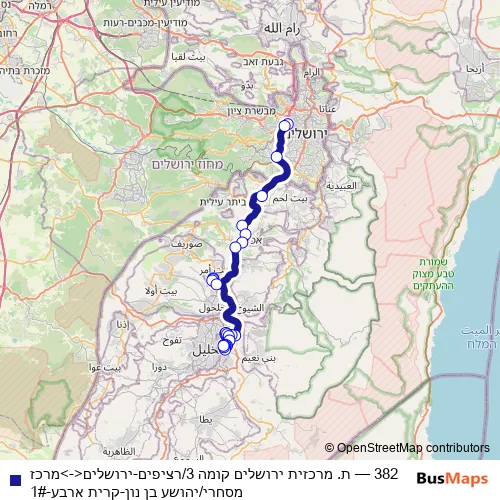 The first stop of the 382 bus route is Jerusalem Central Bus Station 3rd Floor/Platforms and the last stop is Commercial Center/Yehoshua Bin Nun. 382 (ת. מרכזית ירושלים קומה 3/רציפים-ירושלים<->מרכז מסחרי/יהושע בן נון-קרית ארבע-1#) is operational during everyday.