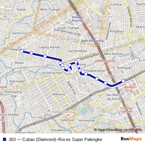 Click here to view the nearest 303 - Cubao (Diamond)–Roces Super Palengke bus stop.
