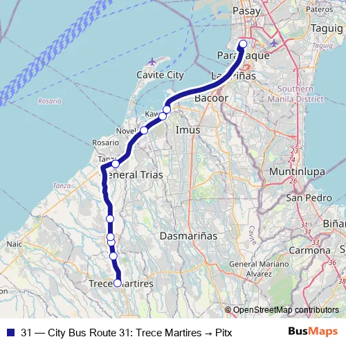 The first stop of the 31 bus route is SM City Trece Martires and the last stop is Pitx Arrivals/Transfers. 31 (City Bus Route 31: Trece Martires → Pitx) is operational during everyday.