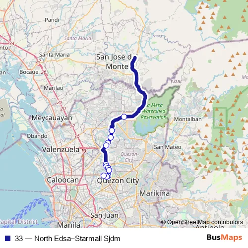 The first stop of the 33 bus route is SM City Fairview and the last stop is SM City North Edsa. 33 (North Edsa–Starmall Sjdm) is operational during everyday.
