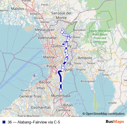 Services on the 36 - Alabang–Fairview via C-5 bus stop at 00:00 +1 on Monday, Tuesday, Wednesday, Thursday, Friday, Saturday, Sunday.