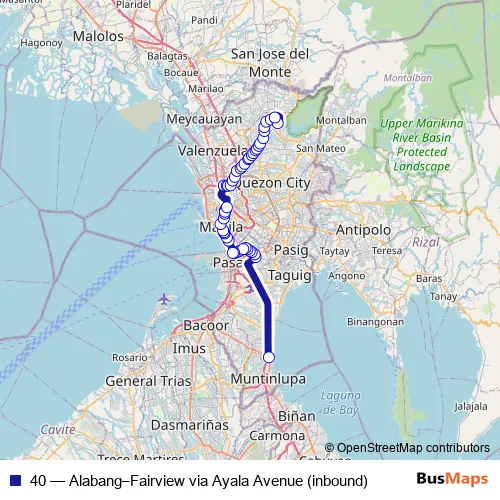 The first stop of the 40 bus route is Vtx and the last stop is Novaliches Public Terminal. 40 (Alabang–Fairview via Ayala Avenue (inbound)) is operational during everyday.