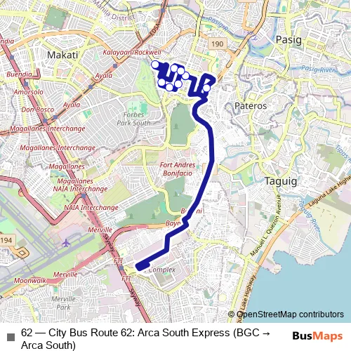 Click here to view the nearest 62 - City Bus Route 62: Arca South Express (BGC → Arca South) bus stop.