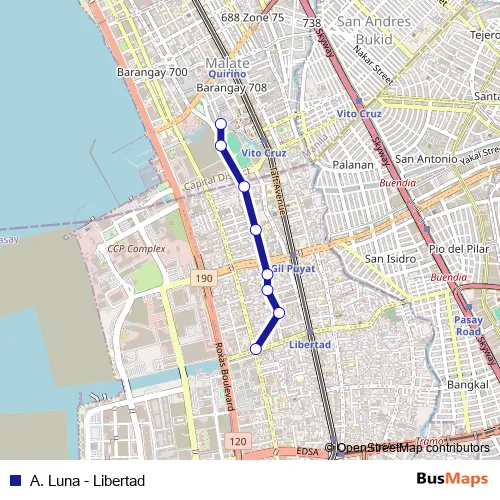 The first stop of the A. Luna - Libertad bus route is Leveriza, Manila and the last stop is Antonio Arnaiz Ave / F.B. Harrison St Intersection. A. Luna - Libertad (A. Luna - Libertad) is operational during everyday.