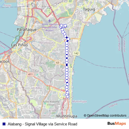 Additional information: Alabang - Signal Village via Service Road has 30 stops and the total trip duration for this route is approximately 56 minutes.