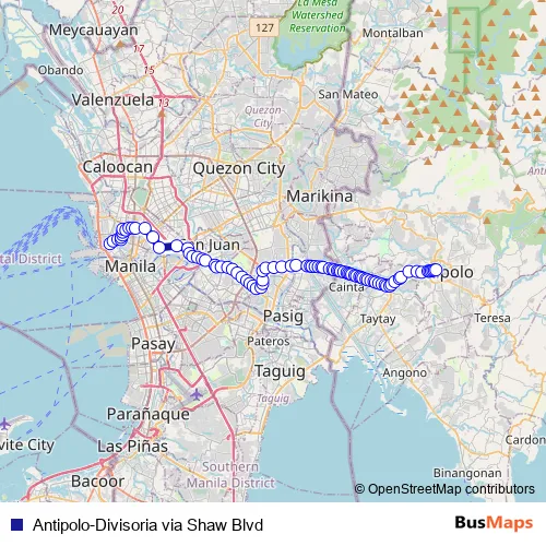 See why over 2 million users trust and consider busmaps.com as the best public transport website. busmaps gives you Cainta Buses suggested routes, real-time bus tracker, line route maps in Cainta, and helps to find the closest Antipolo-Divisoria via Shaw Blvd bus stops near you. No internet available? Download an offline PDF map and bus schedule for the Antipolo-Divisoria via Shaw Blvd bus to take on your trip.