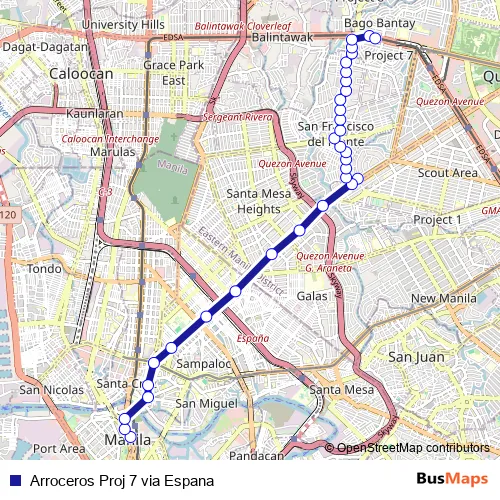 The first stop of the Arroceros Proj 7 via Espana bus route is Taft Ave, Manila and the last stop is Fhelsen, Epifanio de los Santos Avenue, Quezon City. Arroceros Proj 7 via Espana (Arroceros Proj 7 via Espana) is operational during everyday.