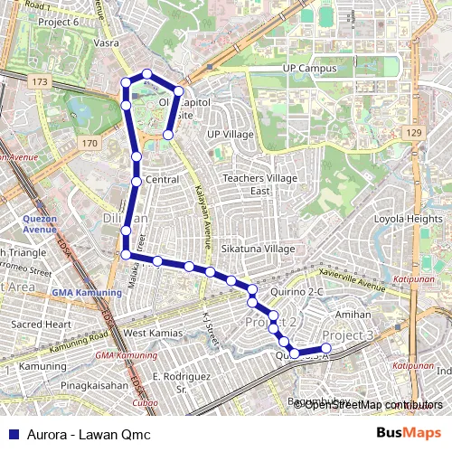 See why over 2 million users trust and consider busmaps.com as the best public transport website. busmaps gives you Quezon City Buses suggested routes, real-time bus tracker, line route maps in Quezon City, and helps to find the closest Aurora - Lawan Qmc bus stops near you. No internet available? Download an offline PDF map and bus schedule for the Aurora - Lawan Qmc bus to take on your trip.